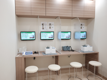 大人用ネブライザーの前には情報発信モニターを設置し、お子様用ネブライザーの前にはアニメが流れるDVDモニターを設置しております。