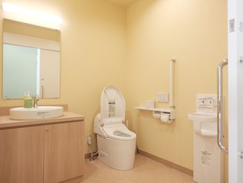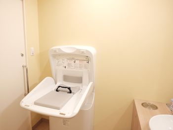 お手洗いにはベビーキープとおむつ交換台を備えていますので、お子様連れでも安心してご来院頂けます。お子様が思いがけずおむつを汚してしまった場合も、おむつとおしりふきのセットをご用意しておりますので、お困りの際は、スタッフまでどうぞお気軽にお声掛けください!