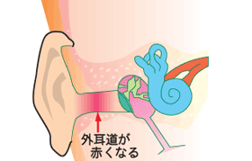 外耳炎は外耳道炎とも呼ばれ、耳の穴から鼓膜までの間(この部分を外耳道と呼びます)にバイ菌(細菌やカビなど)が感染して炎症が起きている状態です。