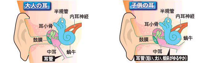 子供に多い理由は耳管が大人にくらべて短く、太く、水平に近いなどの理由でバイ菌が鼻の奥から耳の中にすぐ入り込んでしまうのです。